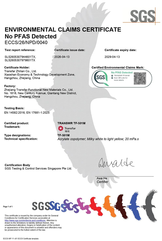 以TF-501M为先锋,传化纺织化学获得全球首张无氟防水剂No PFAS Detected Green Mark证书,是公司长期深耕绿色科技研发的缩影。这不仅是对一款产品的认可,更是对整个行业绿色转型方向的肯定——无氟防水剂是兼顾高性能、高环保、高经济效益的成熟选择。